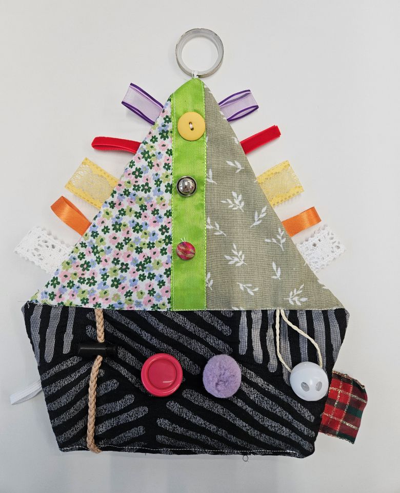 *Ein Demenzschiffchen aus Stoff ist mit vielen Bändern, Knöpfen, Schnallen und ähnlichem benäht. Der Schiffsbauch ist mit Granulat befüllt. Demenzkranke Menschen können sich damit beschäftigen und haben dadurch vielfältige taktile Anreize. Auch als Dekoration eignet es sich.